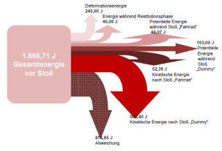 This study primarily investigated deformation energies of bicycles in frontal collisions against a rigid barrier (beam). The impact forces measured for bicycle frontal collisions at a speed range from 20 to 35km/h were analysed and energy split was determined. The task included the execution of bike crash tests using diverse types of bicycle. Following these, we investigated deformation behaviour and identified deformation energy progression. The tests were conducted to establish if collision speed may be inferred from the deformation left on a bike. It turned out that varying degrees of deformation on the forks occurred due to unequal dummy loads during deformation, as well as due to different fork types. We also found that deformation of the bicycle rims (metal rims) only occurred in frontal collisions at speeds of more than 30 km/h.